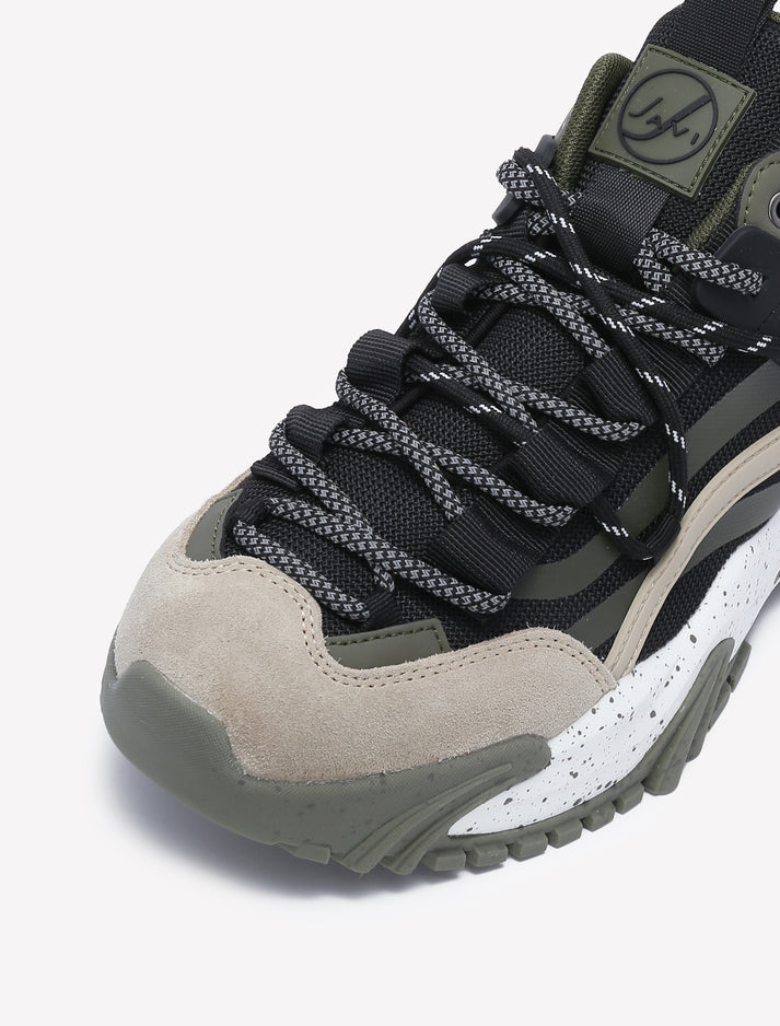- Mixed-material upper with reflective overlays and suede toe