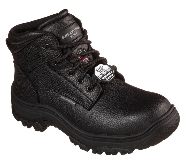 Surround yourself with comfort, style and protection wearing Skechers Work Relaxed Fit®: Burgin - Tarlac ST. Featuring a leather upper on a lace-up ankle height steel toe work boot with a cushioned Skechers Memory Foam™ insole.
