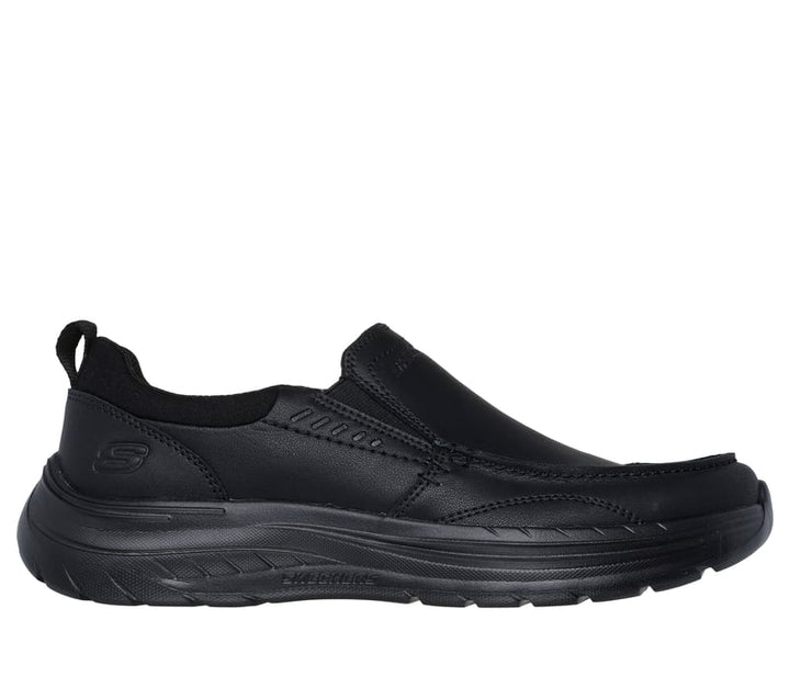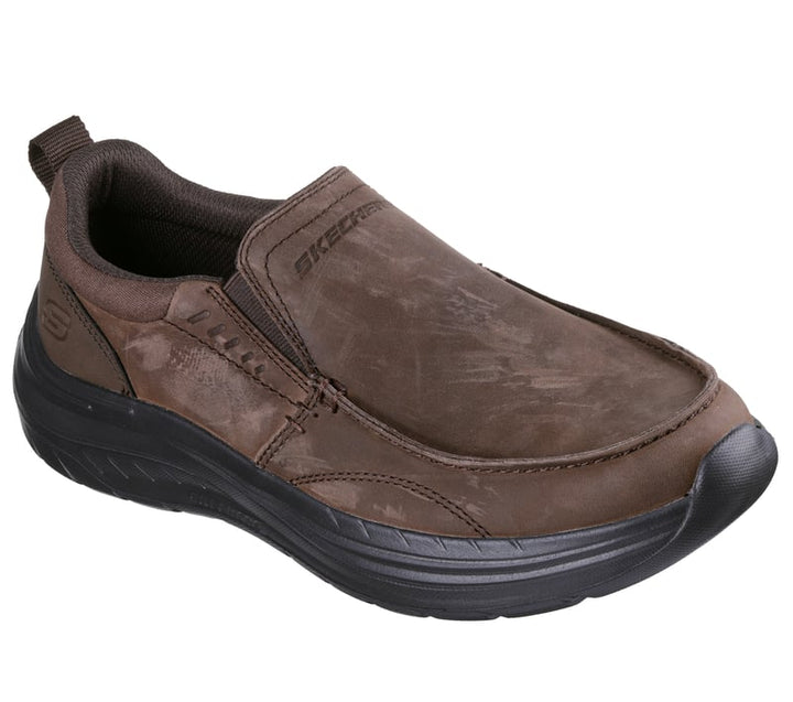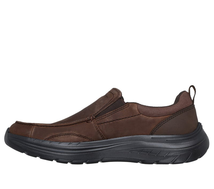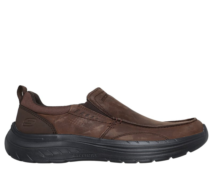 Enjoy casual style and comfort wearing Skechers Relaxed Fit® Decklan - Aldred. This moc toe loafer features a leather upper with dual gore panels, a charcoal-infused Skechers Air-Cooled Memory Foam® insole, and Skechers Memory Arch™ cushioning for added support.