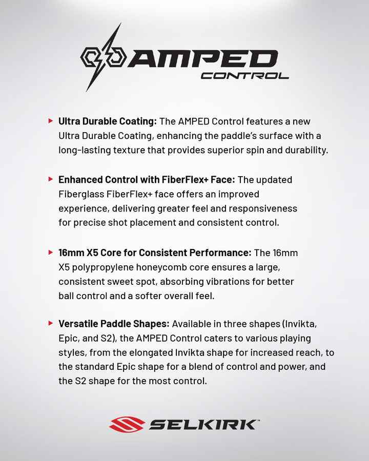 Now, Selkirk is excited to introduce the AMPED Control, a paddle designed to evolve your game. This new iteration features a next-generation Ultra Durable surface coating, that provides long lasting spin, while maintaining the classic AMPED feel that players know and love. The new Ultra Durable coating is the result of hundreds of evolutions and iterations in our R&D process creating a paddle that now delivers longer lasting spin.