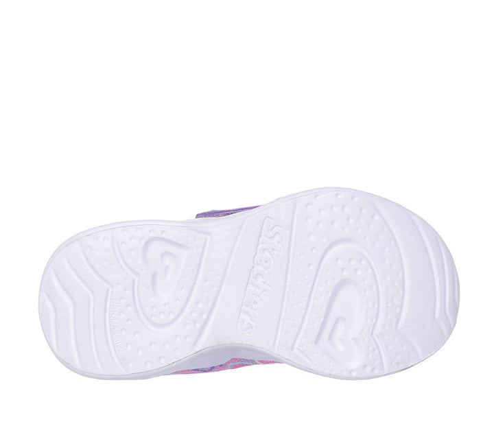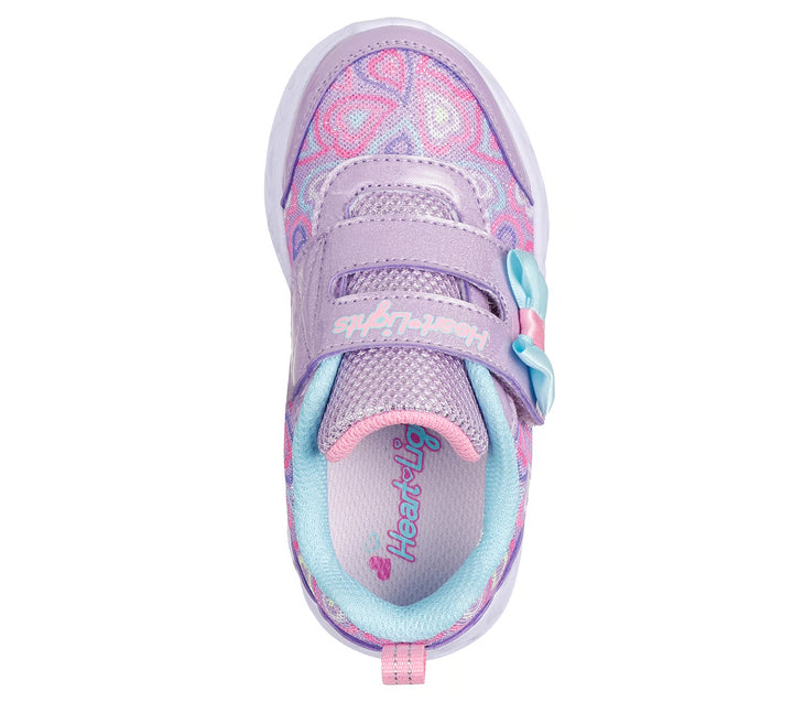 Sparkle and shine in magical delight wearing Skechers Heart Lights® - Boogie Land. This light-up design features a heart print mesh upper with synthetic overlays, an adjustable instep strap closure with bow accent, and a heart sculpted light-up midsole.