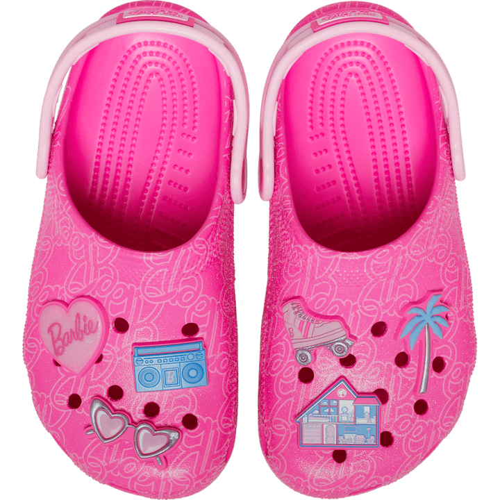 The new Barbie™ Classic Clog is the perfect statement shoe for fashion icons everywhere. This comfortably chic style comes in a power pink hue with a stylish all-over monogram print. Make your look shine with exclusive Jibbitz™ charms featuring a Dreamhouse™, roller skate, palm tree, heart sunglasses, and Barbie™ logo.
