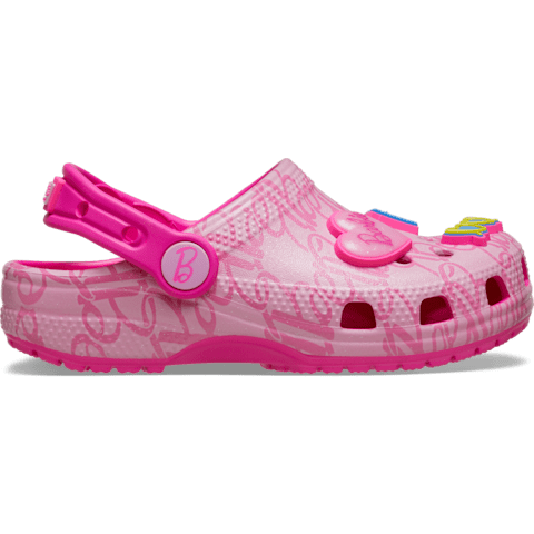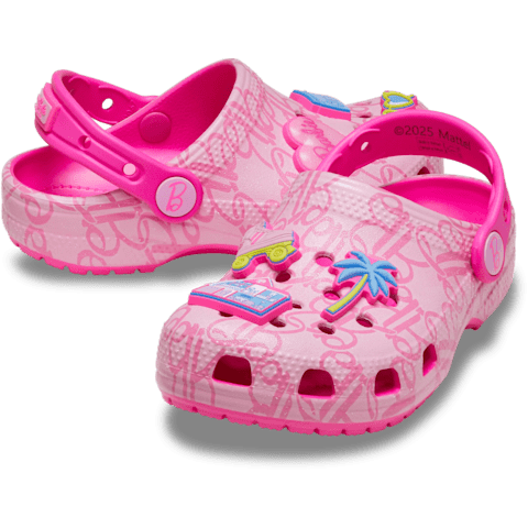 The new Barbie™ Classic Clog is the perfect statement shoe for fashion icons everywhere. This comfortably chic style comes in a pastel pink hue with a stylish all-over monogram print. Make your look shine with fixed Jibbitz™ charms featuring a Dreamhouse™ roller skate, palm tree, heart sunglasses, and Barbie™ logo.
