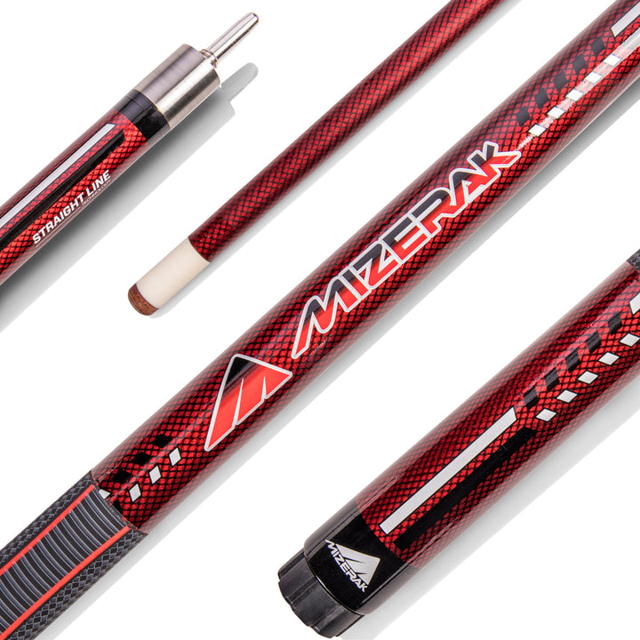 The Mizerak Premium Carbon Composite 3D Grip Cue is a 58" 2-Piece graphite cue. It features Straight Line Composite Technology to prevent warping, a 13mm carbon/fiber ferrule with an 8-layer leather tip, 25mm stainless steel joint with Turbo Lock Technology and a 3D sport texture grip.