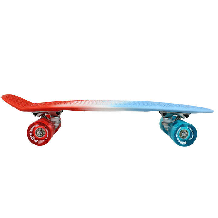 Spectrum Beach Boards are matte yet bright. These amazing spray top and bottom painted mini cruisers will show off underneath the feet of any street surfer. Make you ride unique and irreverent as it can be. Measures 6.3” x 22.5”. Features a PP traction matte painted pattern deck with embossed aluminum 3.25 trucks and 60mm cruiser wheels with abec 7 bearings.