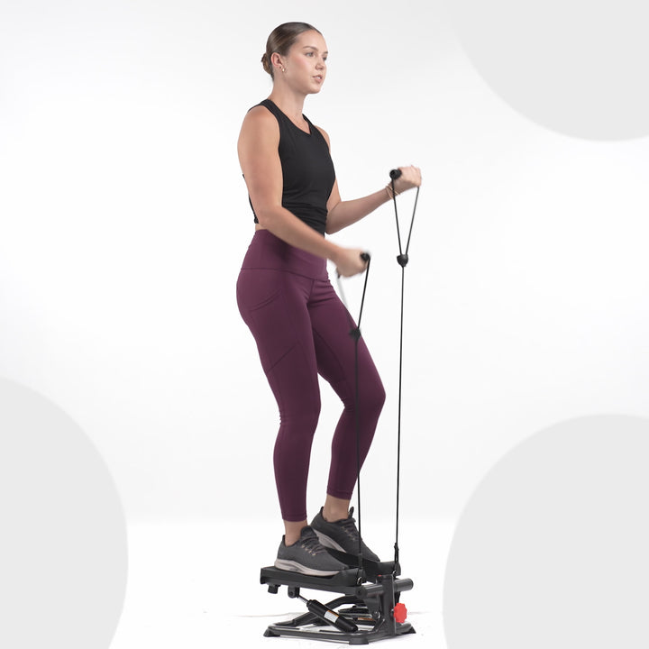The Sunny Health & Fitness 2-in-1 Smart Stepper SF-S0978SMART delivers a complete full body workout right at home. Step up and down to target your lower body while the integrated arm resistance bands engage your upper body all at once. Enjoy a total body challenge that works your legs, arms, core, and more.